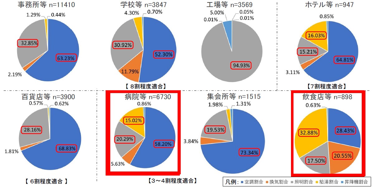 「病院等」では、空調設備の割合だけで全体消費量の58%以上を占め、「飲食店等」では、